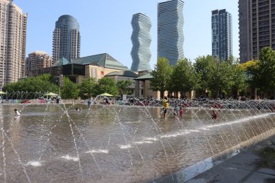 Visiting Celebration Square? The wading pool is open from 10 a.m. to 9 p.m. until Labour Day and 10 a.m. to 8 p.m. after Labour Day (times adjusted as per daylight hours). Please note, while the water levels are shallow and designed for young children, it is not supervised. Parents and guardians must stay close and actively watch their children. Plenty of seating is available nearby to help you keep an eye on the fun.