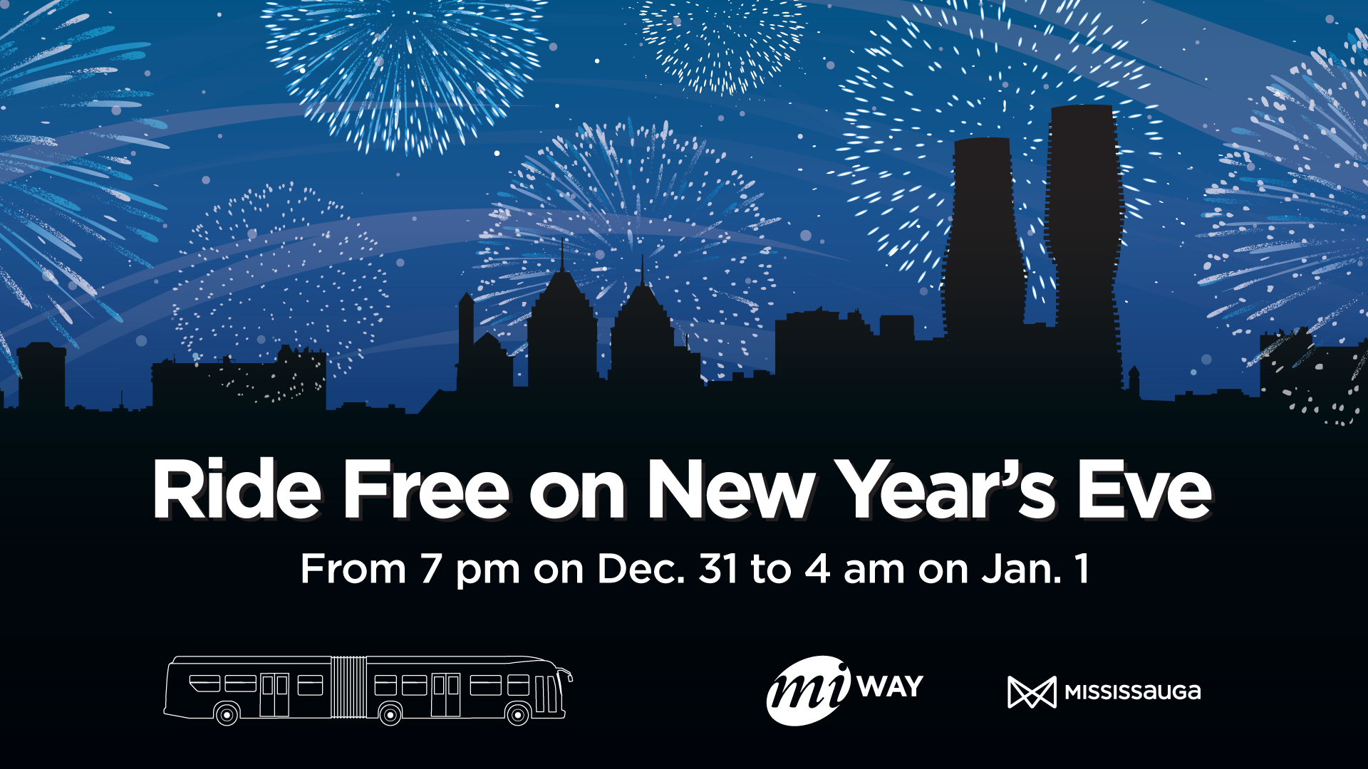MiWay will also offer free service on New Year’s Eve from 7 p.m. on Tuesday, December 31, 2024, to 4 a.m. on Wednesday, January 1, 2025.