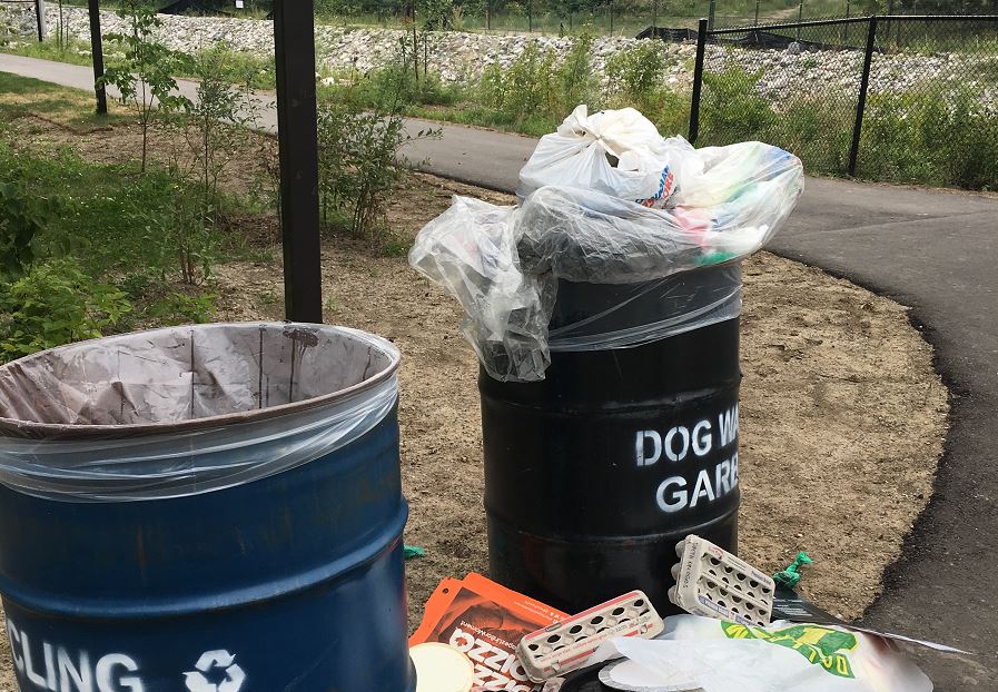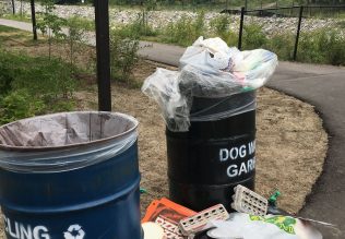 Litter doesn’t belong on the ground. Throw your garbage, dog waste, recycling, disposable masks and gloves in the appropriate bins – black bin for waste, blue bin for recycling. You can put your dog waste in the waste container or the green dog waste container if your local park has one. If the bin is full, please take it with you to throw out at home.