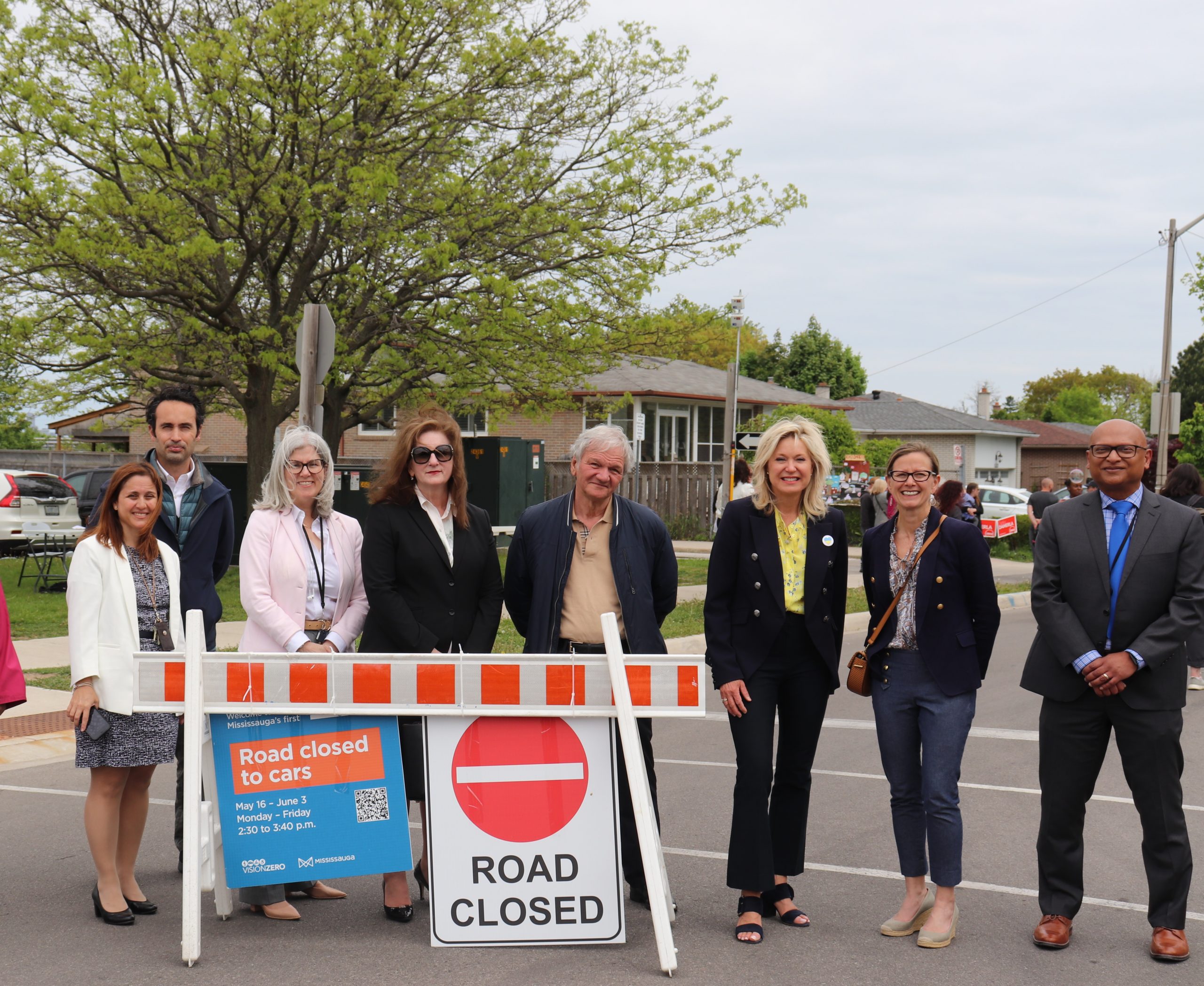 Mississauga celebrates School Streets Pilot Project. L-R: St. Alfred Separate School Principal Julie Lavalle, St. Alfred Separate School Vice Principal Adamo Di Giovanni, Superintendent Mississauga East Family of Schools Cairine MacDonald, Director of Education Dufferin-Peel Catholic District School Board Marianne Mazzorato, Dufferin-Peel Catholic District School Board Trustee Mario Pascucci (Wards 1 & 3), Mayor Bonnie Crombie, Ward 3 Councillor Fonseca, Mathew Thomas, Superintendent of Planning and Operations, Dufferin-Peel Catholic District School Board.