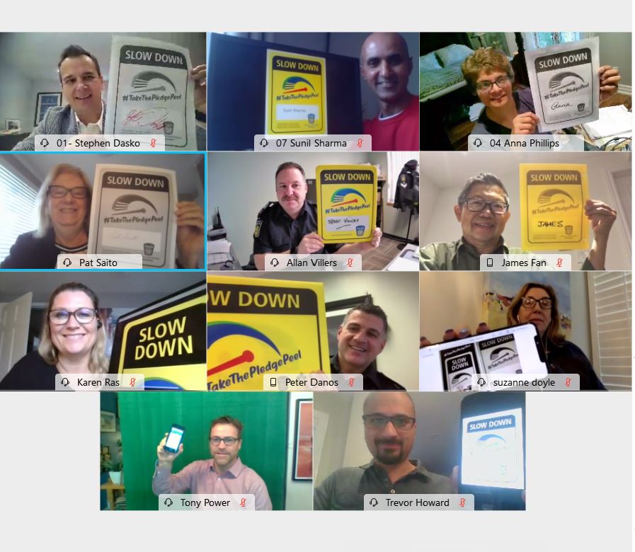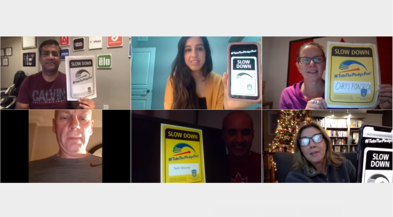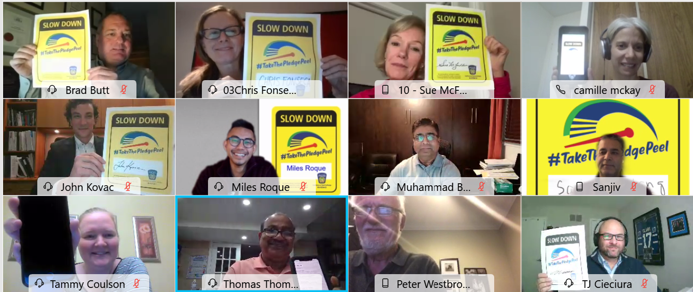 The #TakeThePledgePeel program advocates for drivers to slow down and encourages other road users to be aware of their surroundings on the roads.