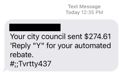 In late January 2022, there have been reports of residents receiving text messages from unknown numbers posing as the City of Mississauga and other local municipalities. The contents of the text indicate the City or Members of Council are giving the end-user an automated rebate with no context provided. Sample message: