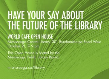 A World Café Open House is being hosted by members of the Mississauga Library Board on Wednesday, October 21 from 7 to 9 p.m. at the Mississauga Central Library. The open house provides an opportunity for Board members to hear public input as a way to inform decisions and plan for the future. Attendees will participate in round table discussions and conversations pertaining to: