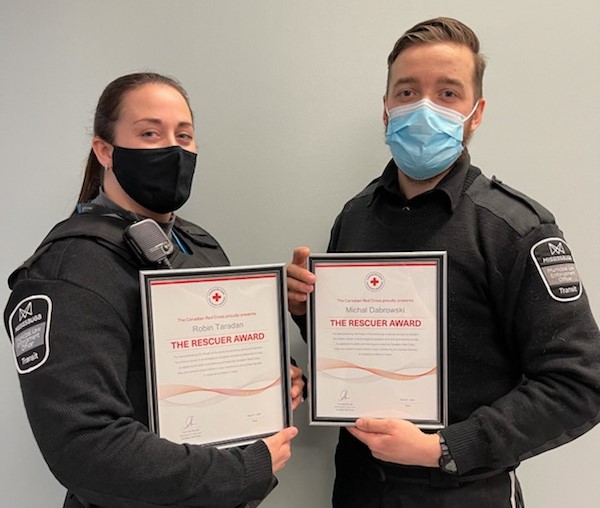 Robin Taradan and Michal Dabrowski, Transit Enforcement Officers with City of Mississauga, receive 2021 Rescuer Award from Canadian Red Cross.