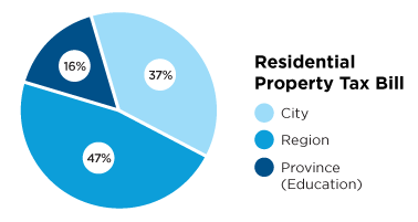 Residential tax bills include taxes collected for the Region of Peel, education, and City taxes. This means that only a portion of the increase that will be visible on your 2025 property tax bill is related to the City budget.