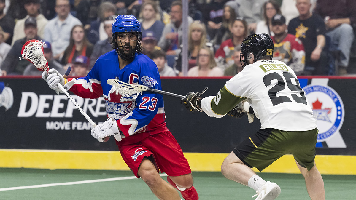 A Toronto Rock player running with a lacrosse stick.