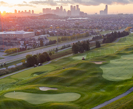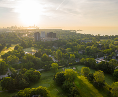 Aerial view of Lakeview Golf Course with City of Toronto skyline in the distance.