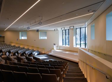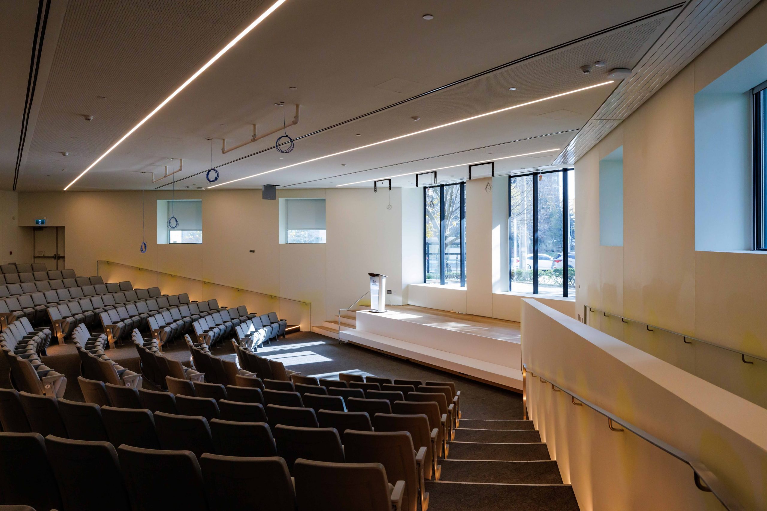 Designed in a modern and adaptable way, the auditorium can be set up for various events, and events can be live-streamed or broadcast.