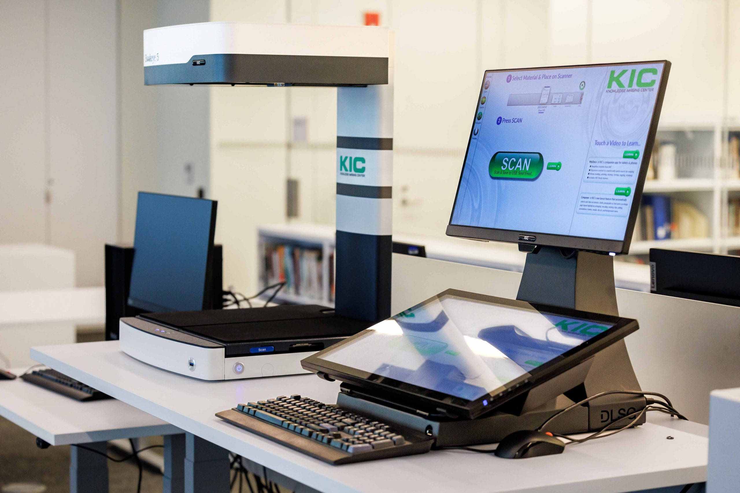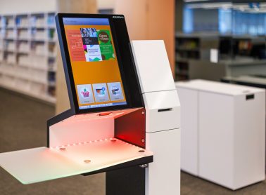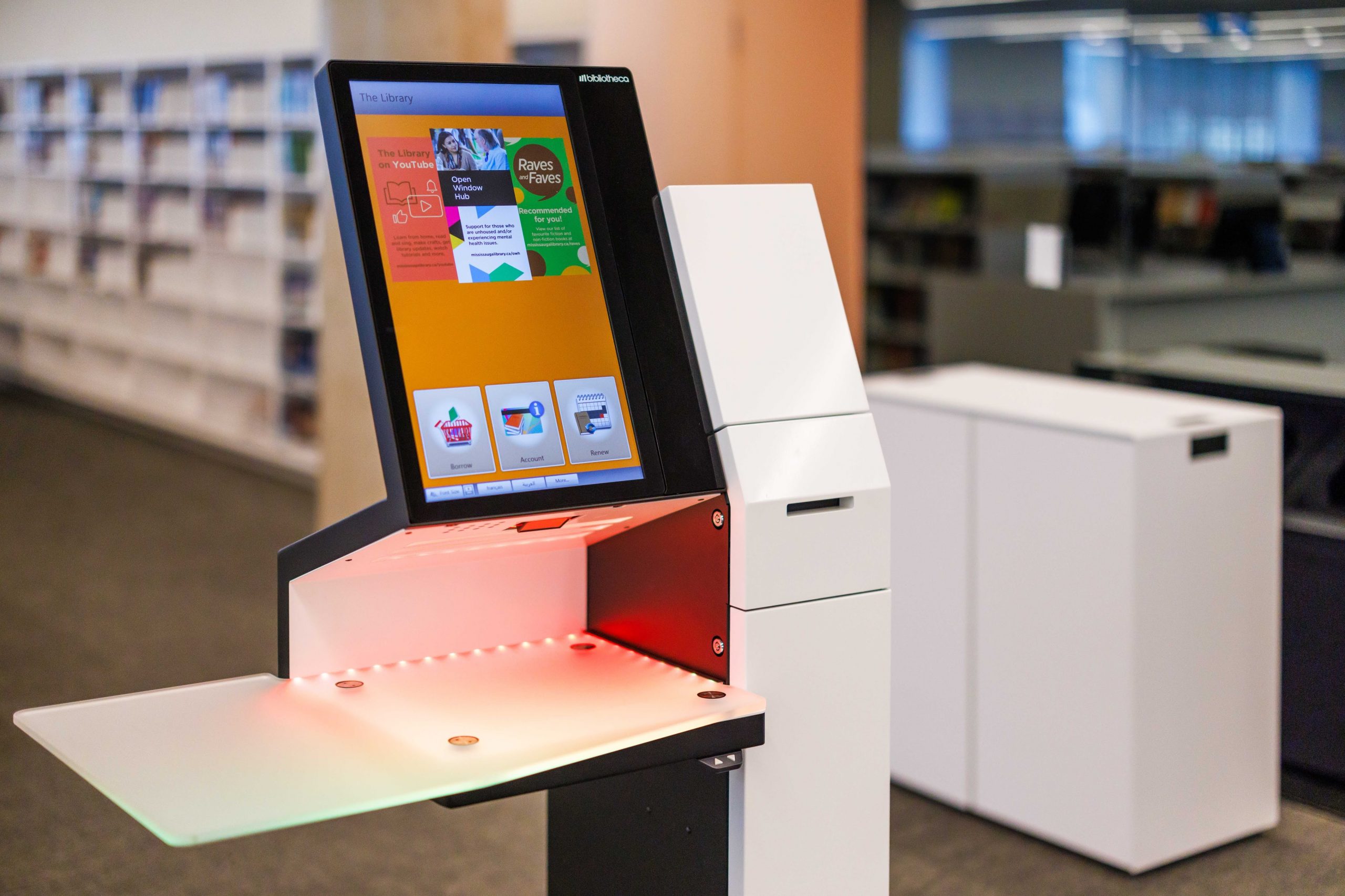Borrow items using the self-check-out kiosks located on all five floors. All self-check-out kiosks are height adjustable and can be accessed with a valid library card.