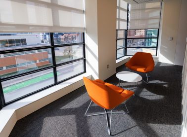 Study spaces are available on all five floors and available on a drop-in basis. Most study spaces include power outlets and charging plugs.