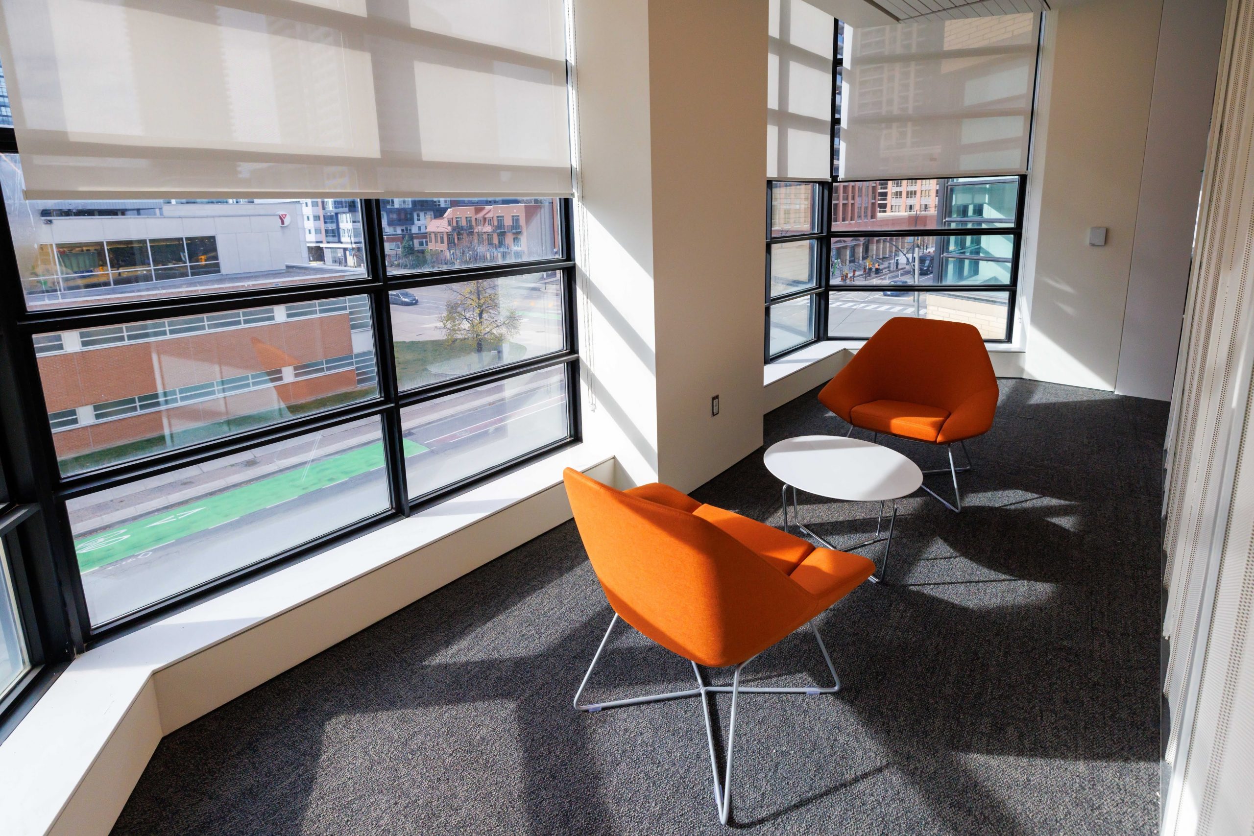 Encased in glass and overlooking Celebration Square, this 6,000 square-foot reading lounge provides you with a quiet space to read, study or lounge in.