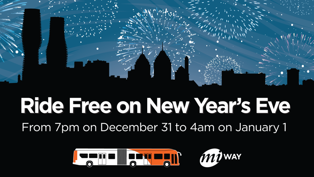 MiWay will offer free service on New Year’s Eve from 7 p.m. on Wed, Dec. 31, 2025 to 4 a.m. on Thurs, Jan. 1, 2026.