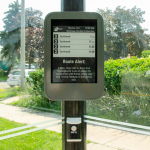 The 10-inch reflective, solar-powered, LCD model, displays information in colour. When you push a button below the screen the display changes to a high-contrast version with larger text. The screen is installed at bus stop #0661 located at Central Parkway West at Semenyk Court, which serves Routes 6 Credit Woodlands and 38 Creditview.
