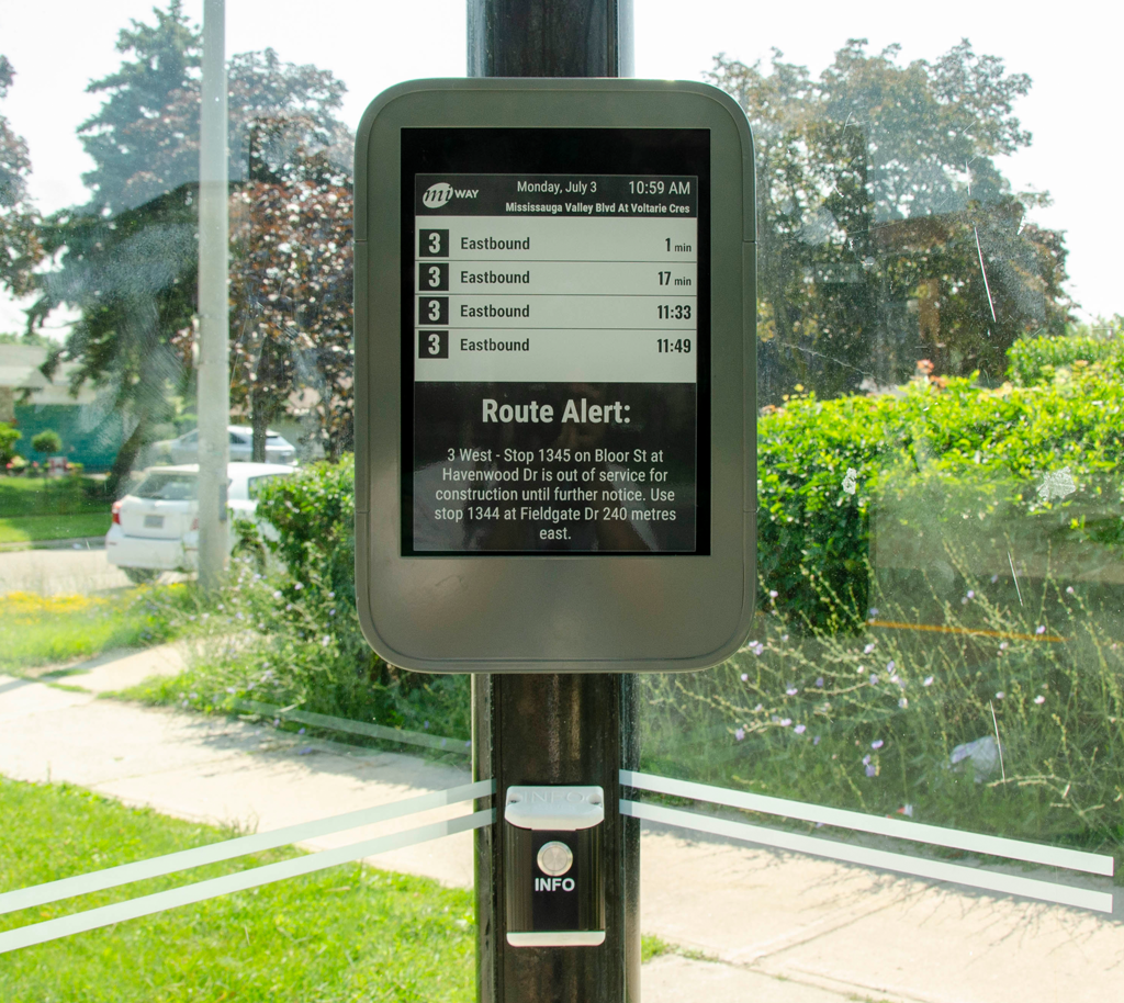 The 13-inch E-Ink model displays information in black and white with high contrast. When you push a button below the screen you can hear an audio announcement of the next bus information. The screen is installed at bus stop #1217 located at Mississauga Valley Boulevard at Voltarie Crescent, which serves Route 3 Bloor.