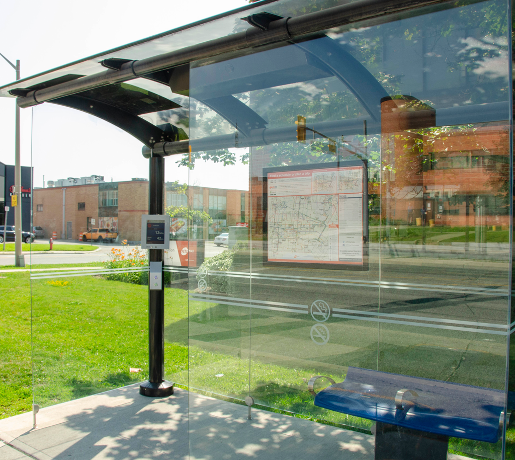 MiWay’s new enhanced bus shelters are larger, provide more seating, and feature a heated and enclosed shelter space for added comfort during colder weather. New digital screens will complement these added amenities and improve the customer experience as more enhanced bus shelters are installed throughout Mississauga from 2024 to 2027.