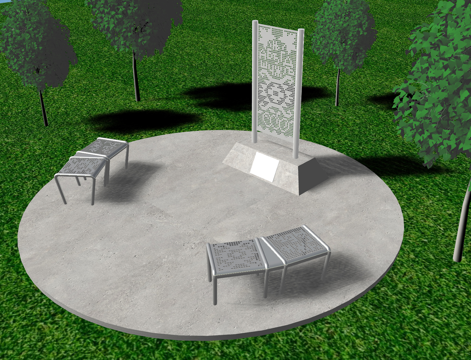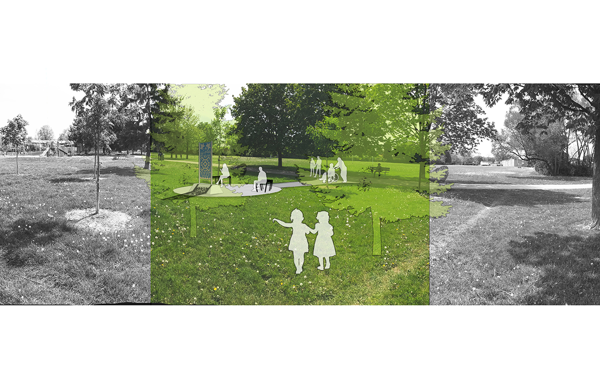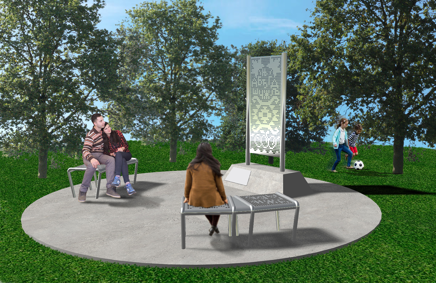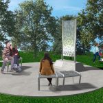 The fully accessible monument will be placed in the middle of the park, adjacent to the playground and lit pathway, and will provide additional seating for park users. Two Serbian Spruce trees are proposed to be planted next to the monument.