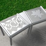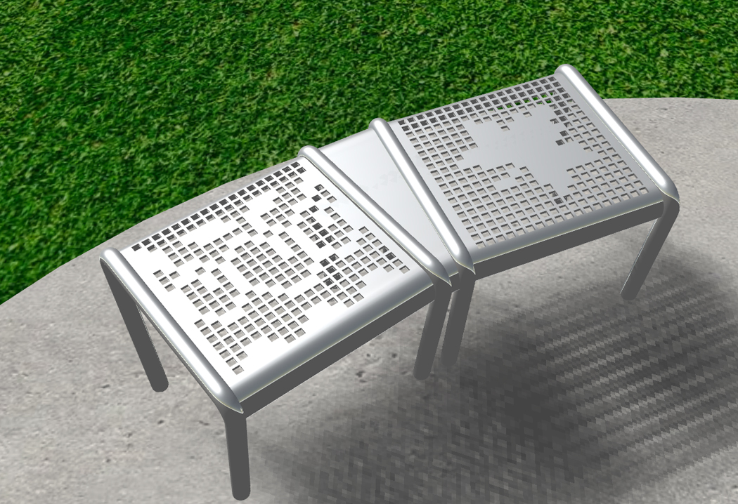 The artwork consists of a vertical panel and two benches designed to look like a hand crochet pattern that is universal to many cultures. The artwork features shapes and cultural symbols of both Serbia and Canada, including weaved kilim (tapestry-woven rug), letters from the Cyrillic alphabet, maple leaves and plums.