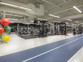 The two-lane walking track located in the fitness area features a view of Lake Aquitaine. It is a safe and climate-controlled walking environment year-round.