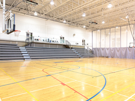 The gymnasium features a full-sized competition basketball court and volleyball court as well as a practice court.