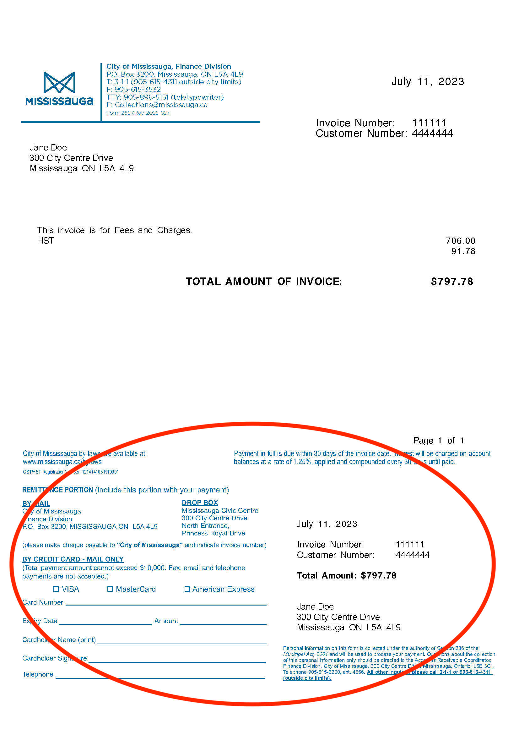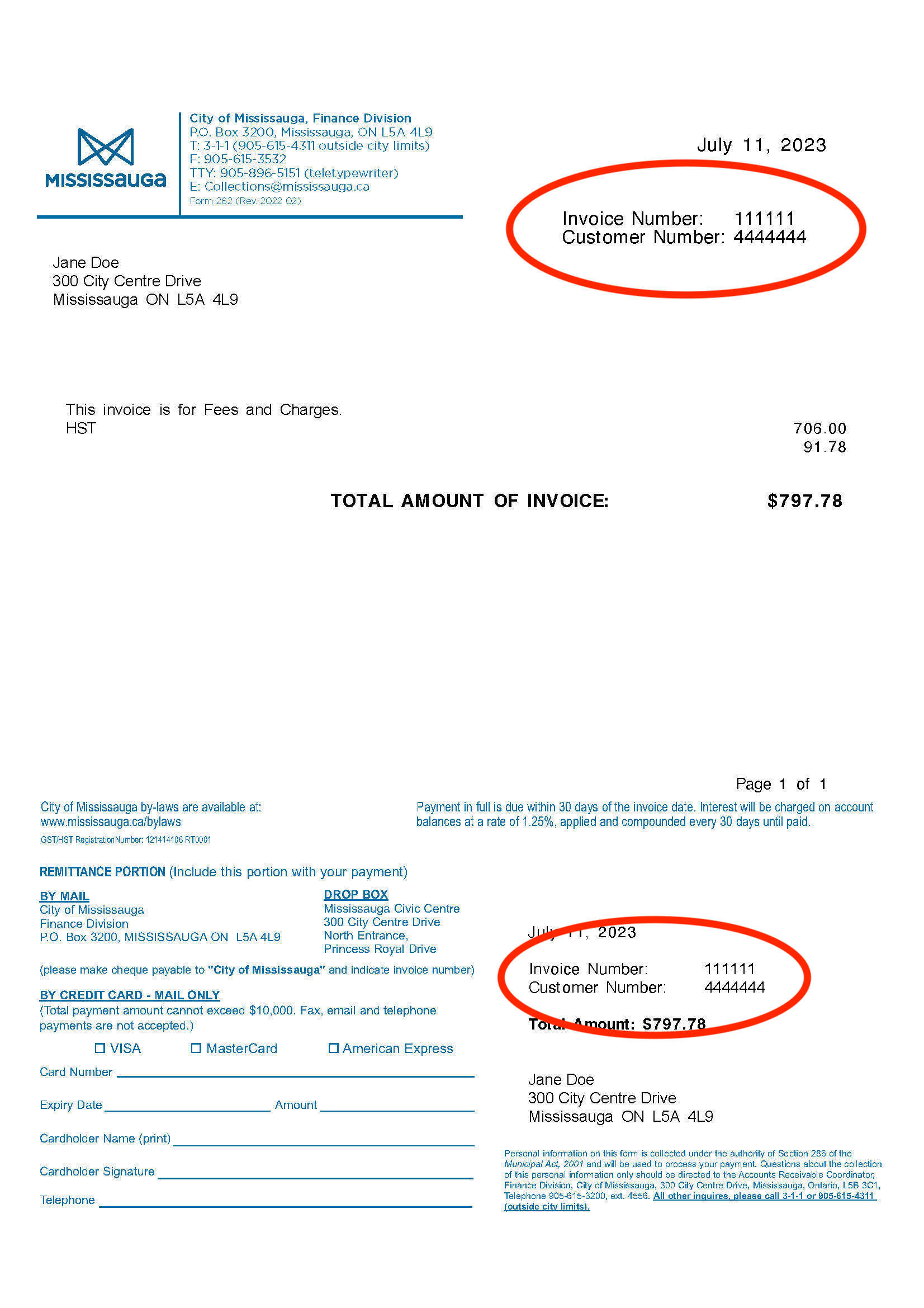 The City accepts cheque and credit card payments. The credit card remittance portion is located at the bottom of the invoice. Both payment types can be mailed or dropped off at Mississauga Civic Centre.