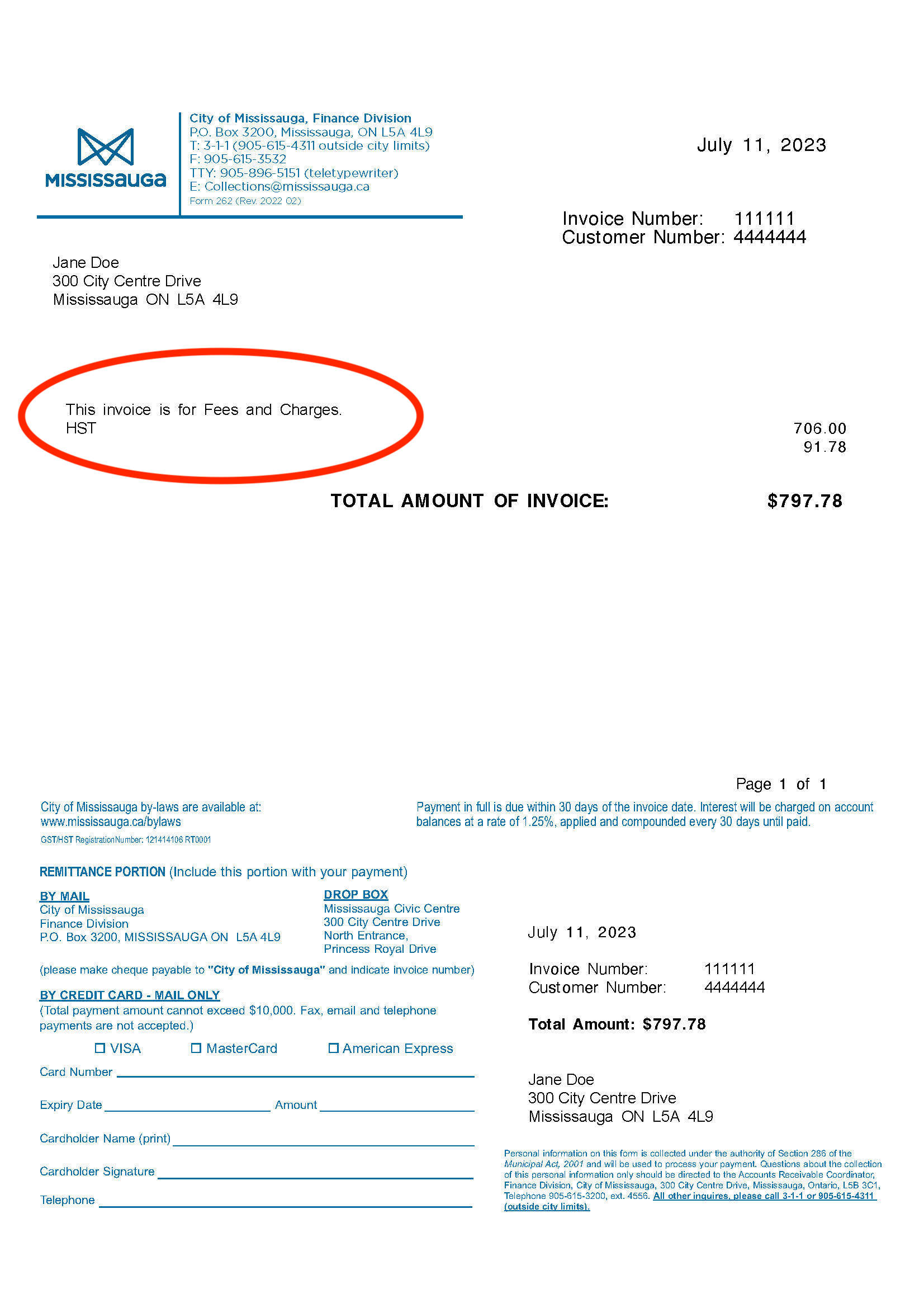 For more information about your invoice, contact Accounts Receivable at collections@mississauga.ca or call 311 (or 905-615-4311 if outside city limits).