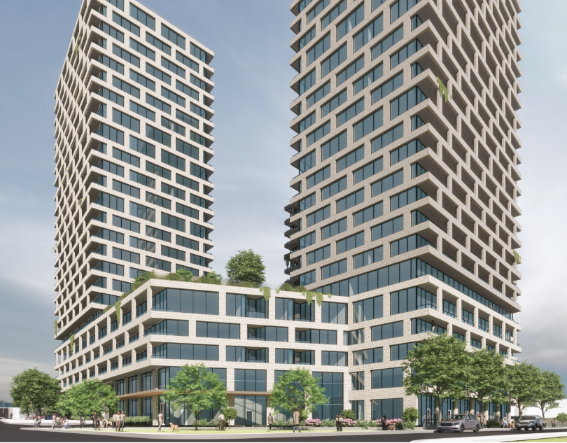 Development application includes two 24 and 25 storey apartment buildings with commercial and retail uses at grade, 15 townhouses and a privately-owned publicly accessible space.