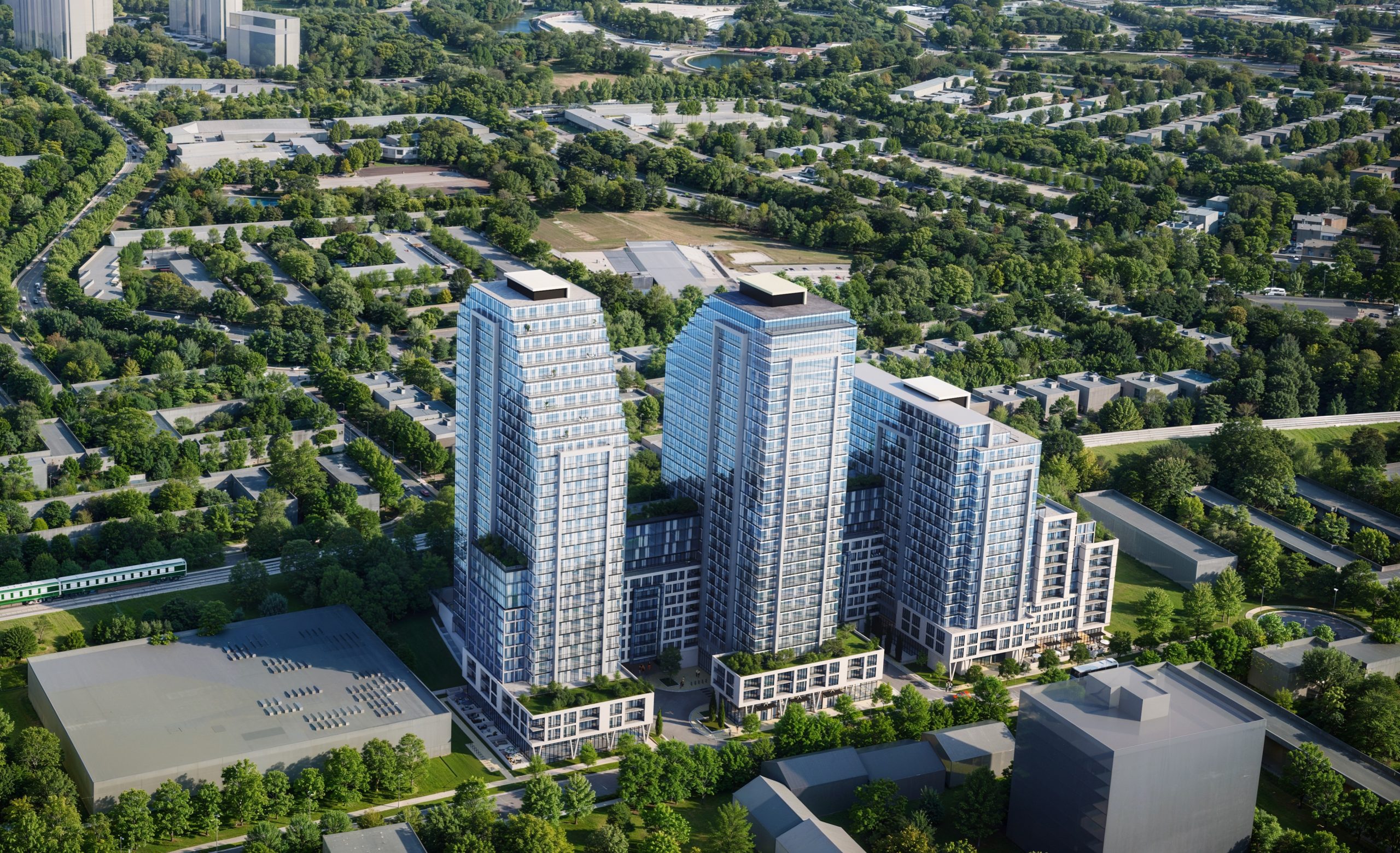 Development application includes 3 apartment buildings, 31, 30, and 20 storeys consisting of 1,342 residential units, 600 m2 of ground floor commercial space and a public park.