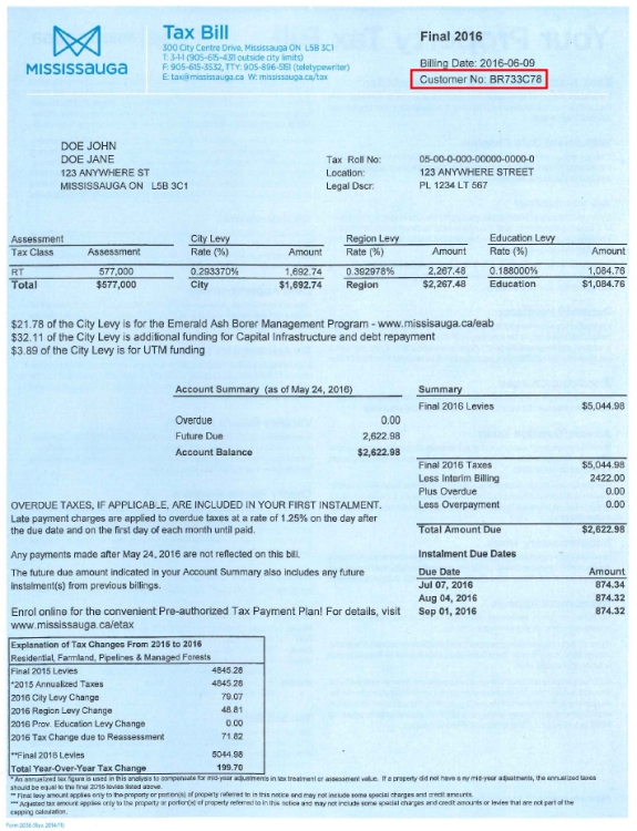 If you don’t have your tax bill or statement, call 311 or email tax@mississauga.ca. The City will mail your customer number to the mailing address on file within five business days.