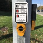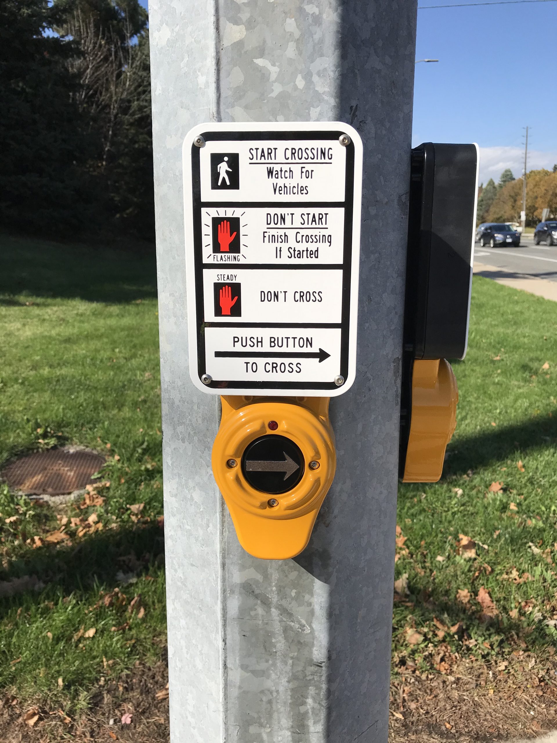 They include standard traffic signals (green, amber, red lights) to control vehicle traffic on the main street and standard pedestrian walk/flashing and solid don’t walk signals activated by push buttons.